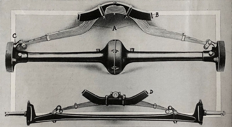 Both are attached to the frame by multi-leaf transverse springs. This simple arrangement, combined with the flexible frame, allowed for maximum up and down movement. This was a huge asset on unpaved, often rutted, roads.