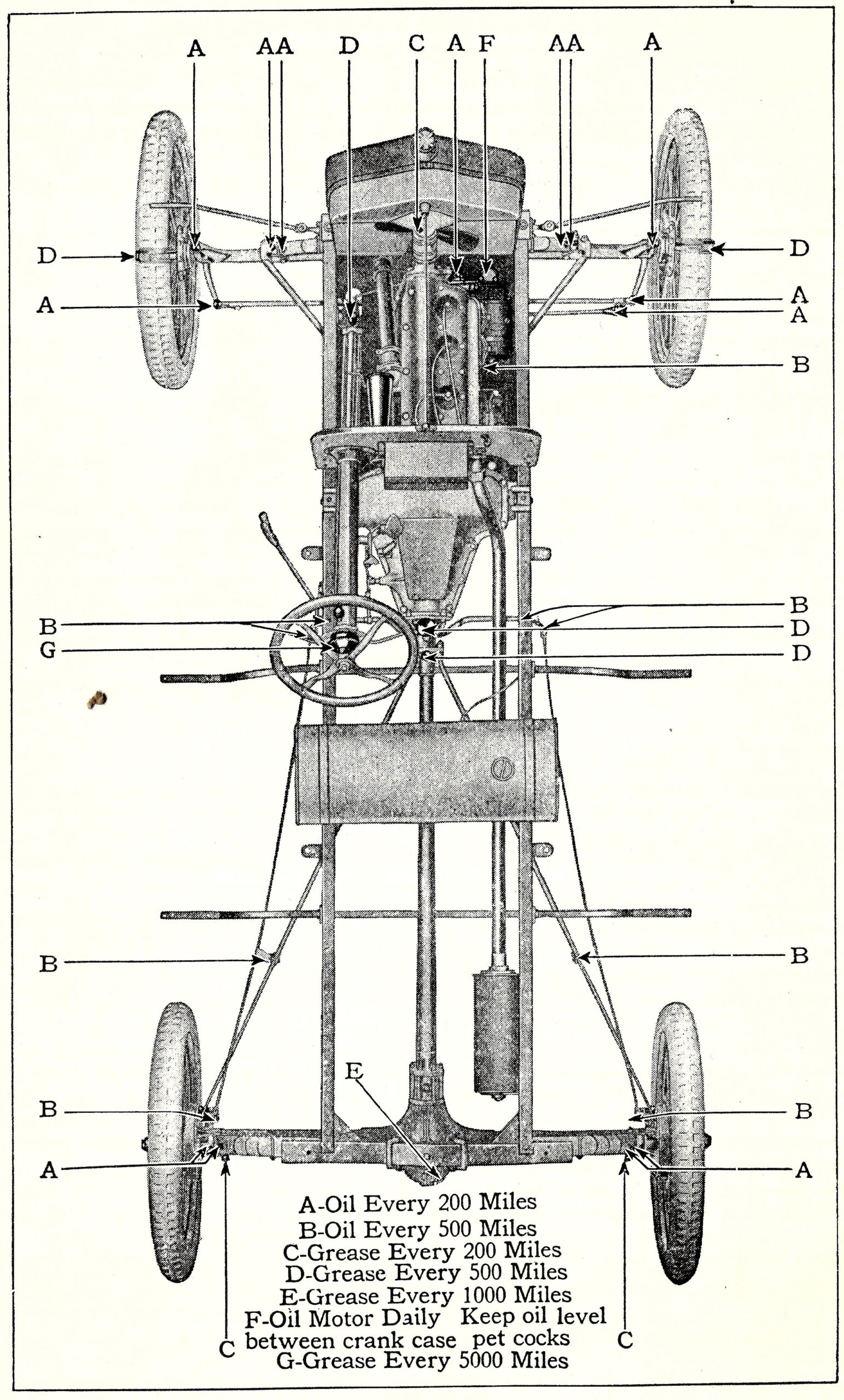 Unlike modern cars, the chassis, axles and steering assembly on a T need to be lubricated on a regular schedule. The attached chart from the Ford Model T owner’s manual shows the locations and frequency. Regular engine oil is OK in many areas. Heavy grease is needed within what are called cups. Once filled, these should be turned at the schedule suggested to press the grease into the fittings.